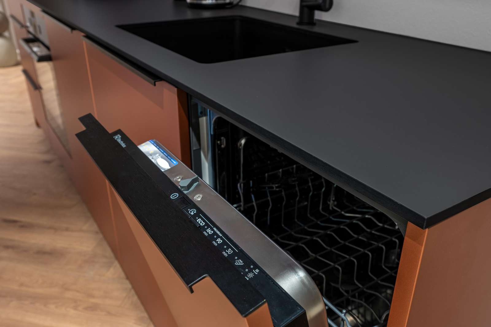 ⬩Kitchen & dining: Full kitchen with refrigerator, stove, oven, dishwasher, hot water kettle, cooking basics, dishes, and wine glasses.