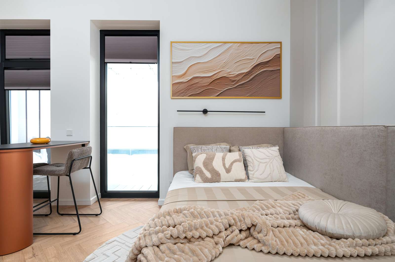 ⬩Living & sleeping area: Double bed with fresh linens, TV, and heating. Clothing storage and stylish decor for a restful stay.